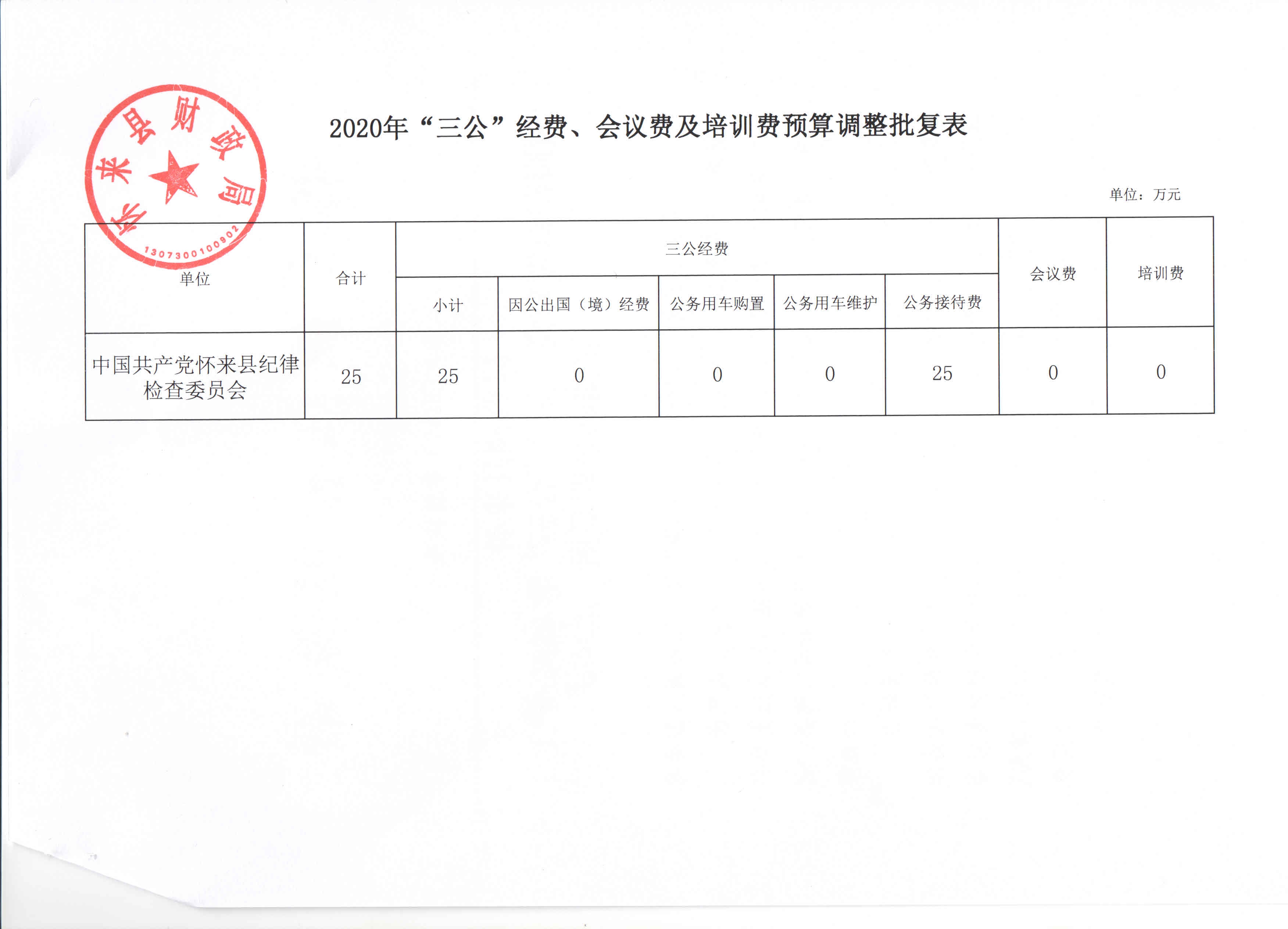 中国共产党怀来县纪律检查委员会2020年“三公经费”、会议费及培训费预算调整批复表.jpg